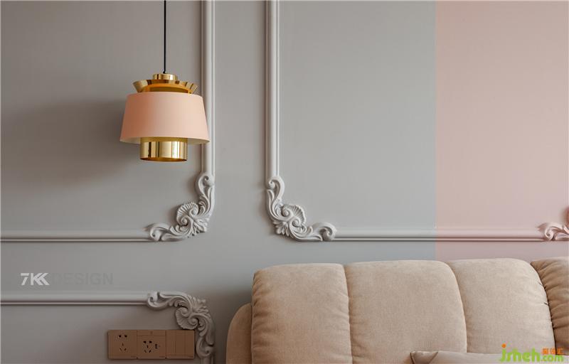 二樓朝南的女兒房法式風(fēng)情,浪漫夢幻。床頭背景墻粉色與淺灰色拼接,墻面上用石膏線勾勒出經(jīng)典的線條,盡顯法式優(yōu)雅。天花板搭配白色球狀吊燈造型優(yōu)美,粉色窗簾與粉色背景墻相呼應(yīng),明亮寬敞的空間,整體充滿連貫性。