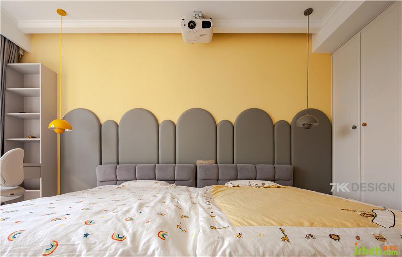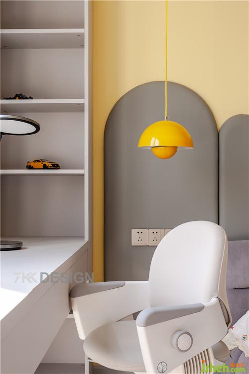 背景墻上方是投影儀,正面有投影幕布,為孩子們開(kāi)啟屬于他們的童話(huà)世界,樂(lè)享影視帶來(lái)的歡趣。左右飽和度較高的黃色和灰色的吊燈搭配簡(jiǎn)約個(gè)性。