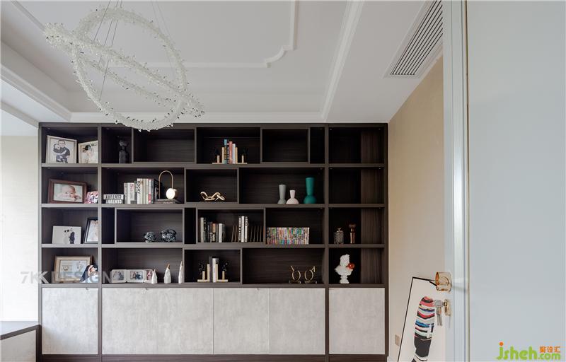 兒童的多功能書(shū)房,靠墻定制一整排到頂?shù)臅?shū)柜+裝飾柜形式,美觀實(shí)用。中間是預(yù)留書(shū)桌的空間,拍攝時(shí)業(yè)主還沒(méi)有買(mǎi)回來(lái)。