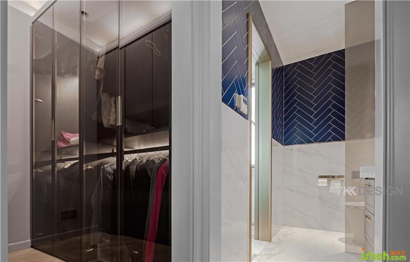 衛(wèi)生間干區(qū)另一側(cè)是步入式衣帽間,靠窗空間是淋浴區(qū)。步入式衣帽間選擇玻璃樣式,內(nèi)藏?zé)魩В蛟旄呒?jí)感的衣帽間。