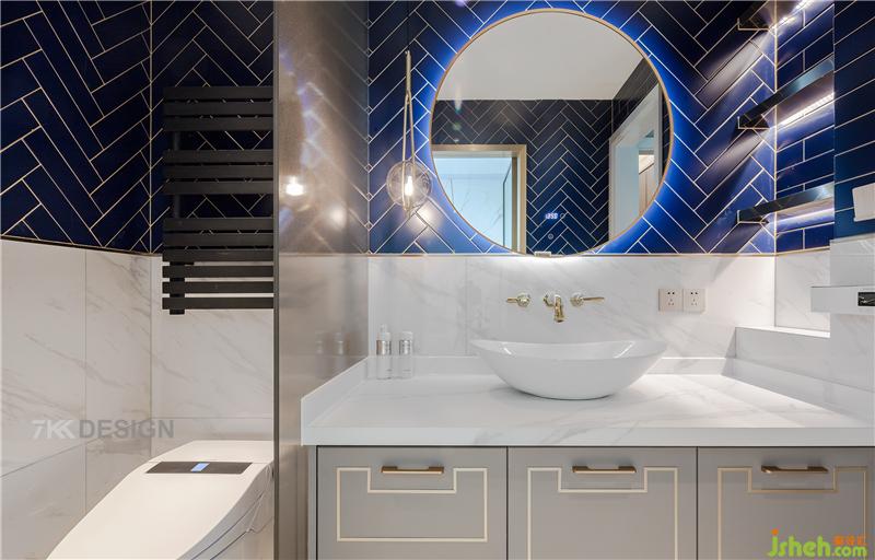 三樓衛(wèi)生間,主要為夫妻和兩個(gè)男孩使用。衛(wèi)生間干濕分離設(shè)計(jì),臺(tái)盆區(qū)與馬桶間采用玻璃隔斷。臺(tái)盆柜上方選擇高顏值的臺(tái)上盆,曲線(xiàn)造型優(yōu)雅大氣。墻面下面一半是白色墻磚,上面一半選擇海洋藍(lán)幾何型瓷磚拼接,打造清爽時(shí)尚的洗漱空間,金屬元素的點(diǎn)綴出輕奢精致的品質(zhì)生活。