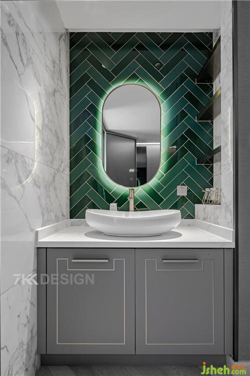 二樓衛(wèi)生間主要為父母,女兒和客人使用,干區(qū)臺(tái)盆柜上方同樣選擇高顏值的臺(tái)上盆,正對(duì)的墻面選擇深淺不一的墨綠色瓷磚拼接,橢圓形智能鏡子搭配,臺(tái)盆右側(cè)的墻面凹進(jìn)去做壁龕使用,上面定制層架擺放洗漱用品。