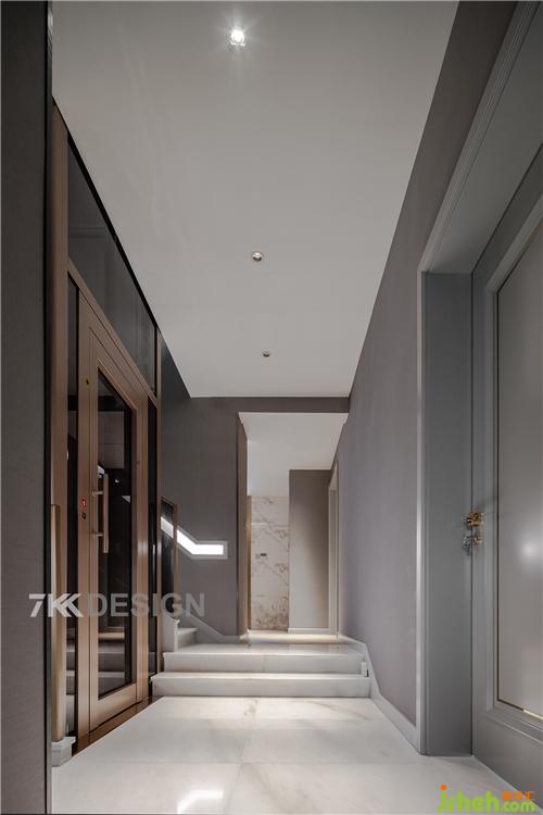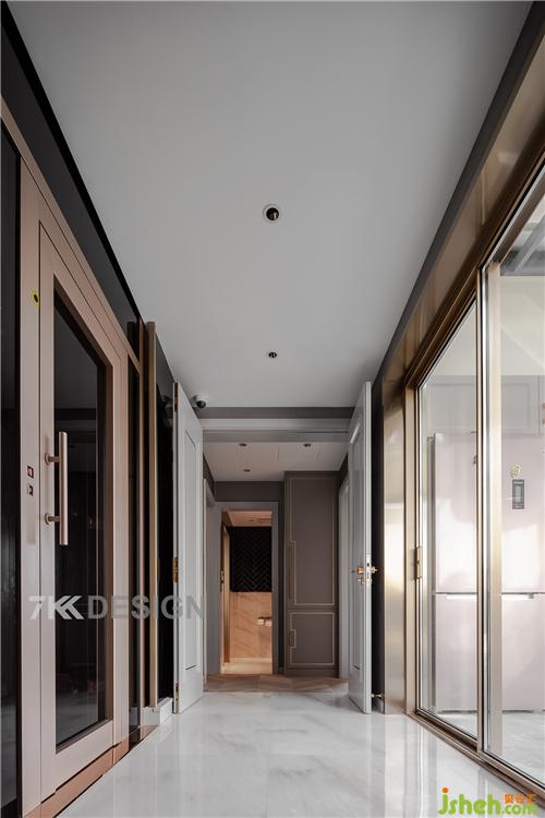 三樓走廊,走廊左側(cè)是電梯位置,右側(cè)是后來(lái)重新搭建的洗衣房空間。選擇玻璃移門(mén)使得走廊空間光線充足,整體空間寬敞明亮。走廊盡頭進(jìn)去是主臥和衣帽間及衛(wèi)生間空間。地面選擇地磚與地板拼接,劃分功能區(qū)域。