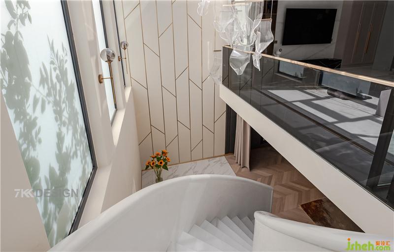 弧形樓梯上方搭配藝術(shù)吊燈,豐富空間層次感,美觀實(shí)用。