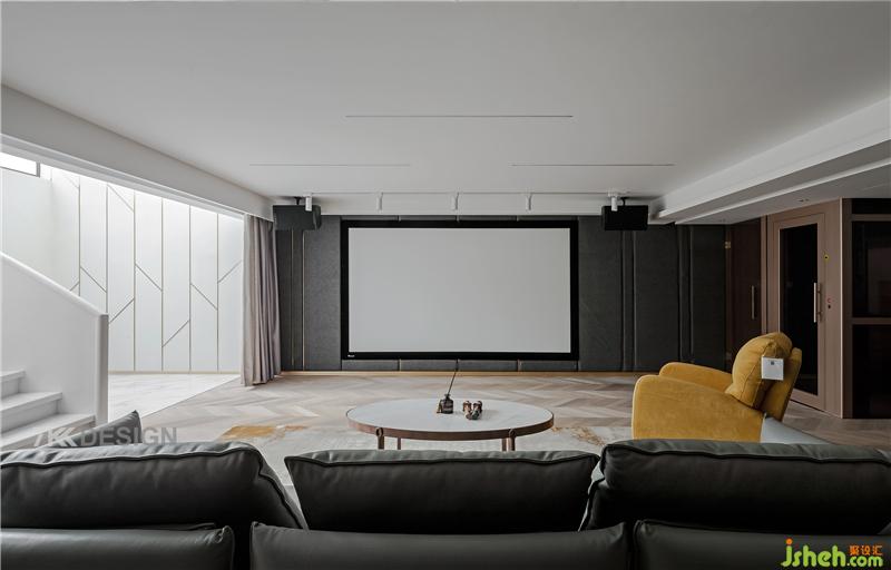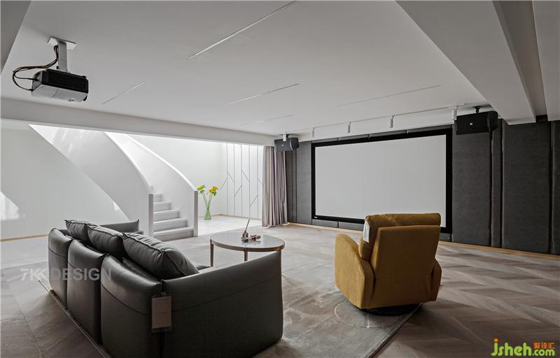 地下室影音室,墻面采用灰色軟包材質(zhì),減少噪音。選擇內(nèi)嵌投影幕布,享受強(qiáng)大的視覺(jué)效果,頂部嵌入式燈帶設(shè)計(jì),閑暇之余,在這樣寬敞的空間里,聽(tīng)著音樂(lè)或看一場(chǎng)電影,享受一場(chǎng)全身心的放松是何等的愜意。