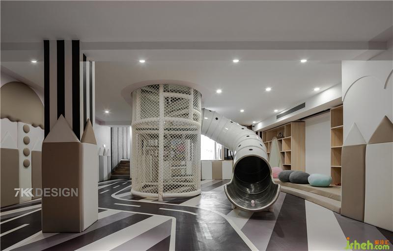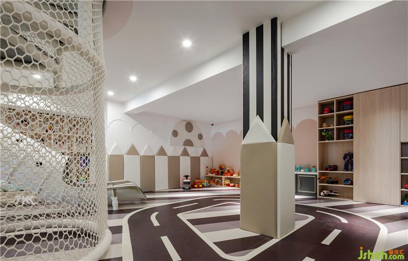 從影音室進(jìn)來(lái)又是一番天地,屬于小孩子的歡樂(lè)世界,地下室游樂(lè)園,里面有跑道,滑滑梯,小廚房,畫(huà)畫(huà)墻,圖書(shū)角。真的好有愛(ài)的設(shè)計(jì),連大人都羨慕。作為這對(duì)夫妻的小孩真的是超級(jí)幸福。從滑滑梯上去可以通到一樓,進(jìn)門(mén)玄關(guān)可以看到網(wǎng)狀的結(jié)構(gòu)上海別墅裝飾。