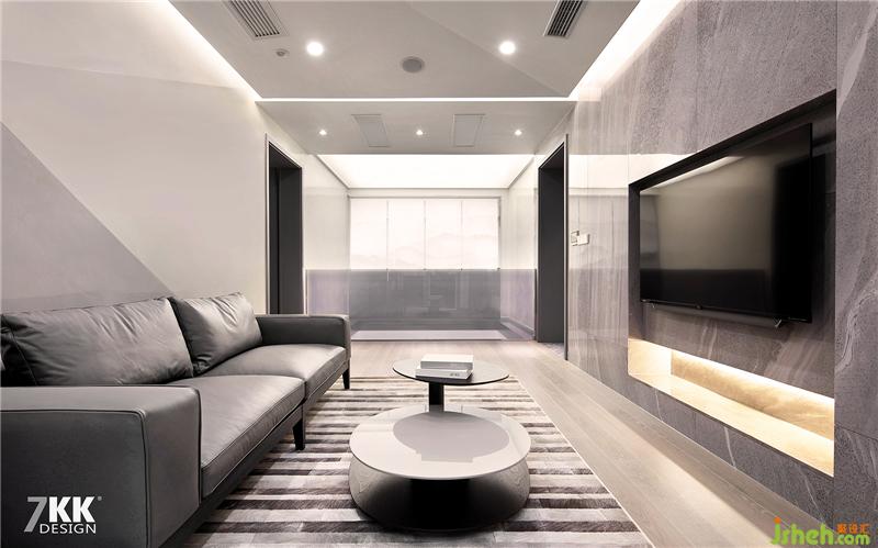 二樓的起居室,干凈簡潔。仔細(xì)看沙發(fā)背景和頂面都是異型造型,遙相呼應(yīng),本案的不規(guī)則主題各處顯現(xiàn)。在客廳靠近陽臺的空間做了挑空處理,另一邊是父母的生活陽臺。