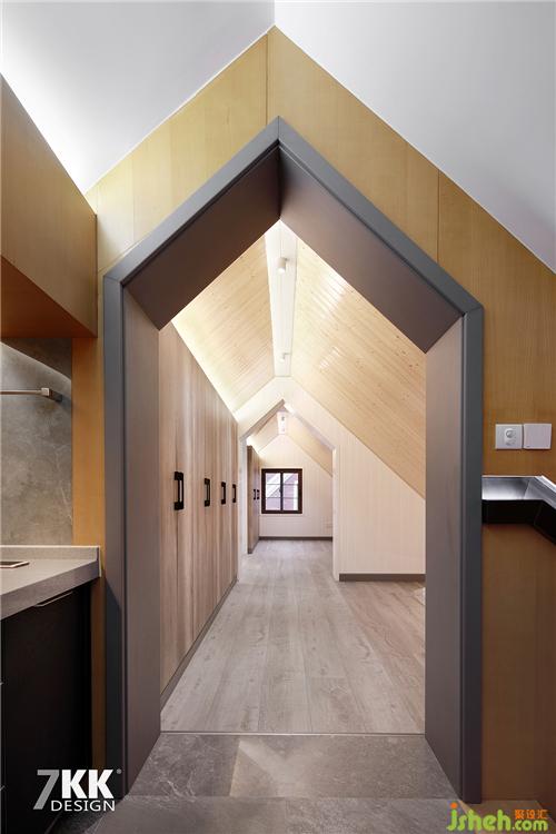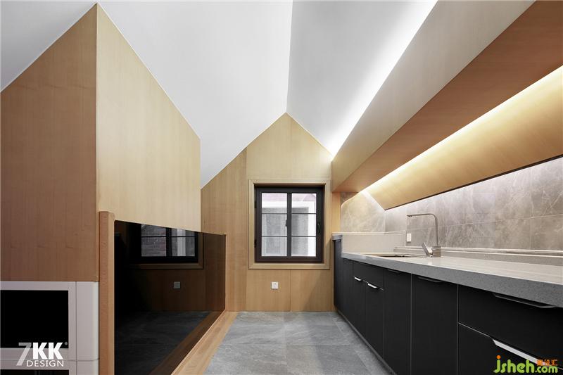 這是利用頂層斜頂?shù)那擅罾茫瑒偤么钆湔w異型造型的主題,在燈光合理運用的襯托下,深與淺,暖與冷,打造獨特藝術(shù)氛圍的廚房空間。是不是很別致啊。