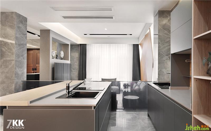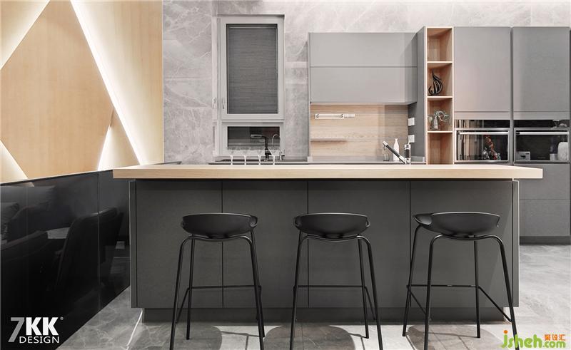 開放式廚房集休閑與實用一體,島臺臺面采用石英石搭配灰色烤漆門板,中西廚分離的形式,新穎時尚。也是高品質(zhì)家居的一種體現(xiàn)。