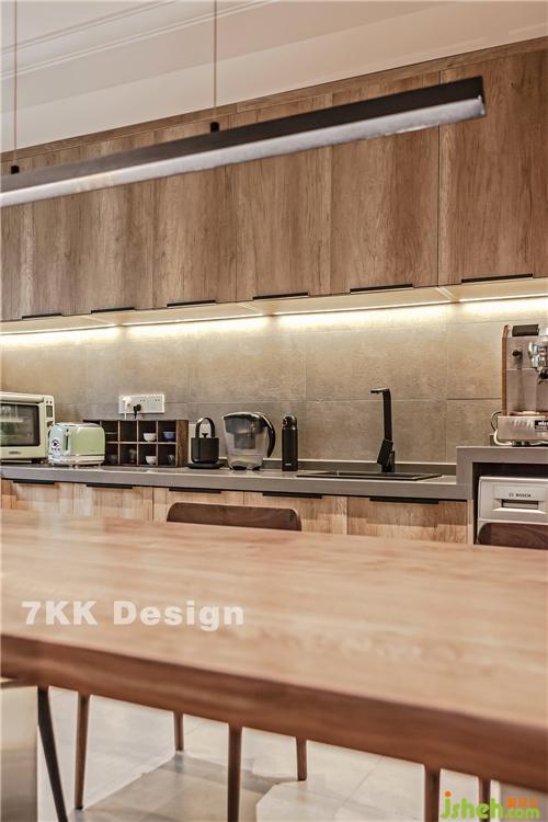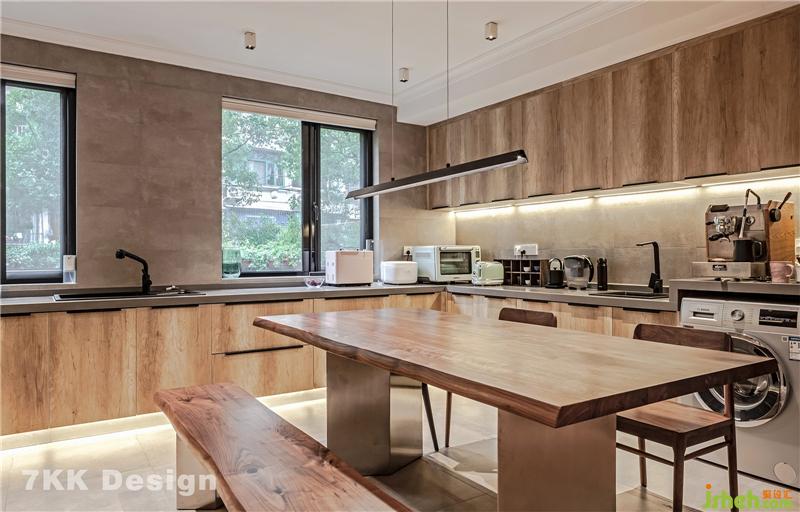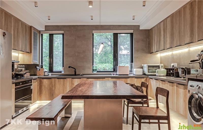 2、業(yè)主希望有個大的廚房空間,敲掉原有廚房和餐廳公共墻體,打造開放式廚房,沿著窗戶做了超大U型廚房操作臺面,中間放置餐桌,開放式的形式讓整體空間更寬敞,收納也更強大。利用角落臺面空間下側(cè)放置洗衣機。使用起來也比較方便。
