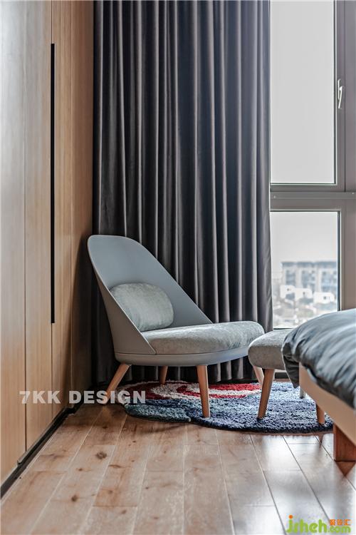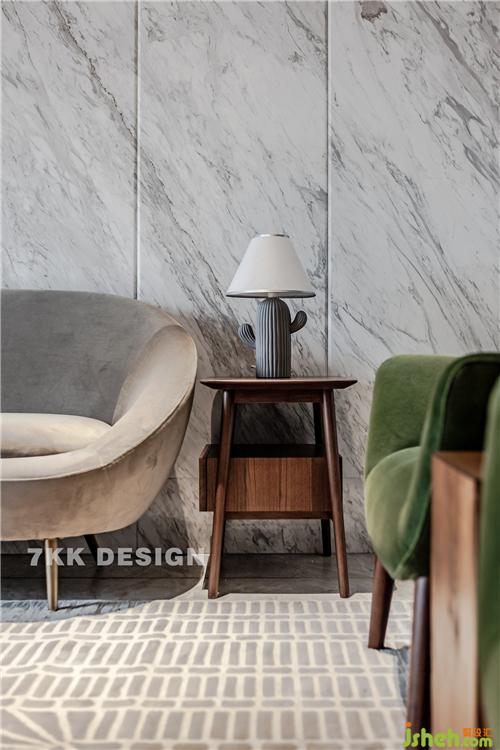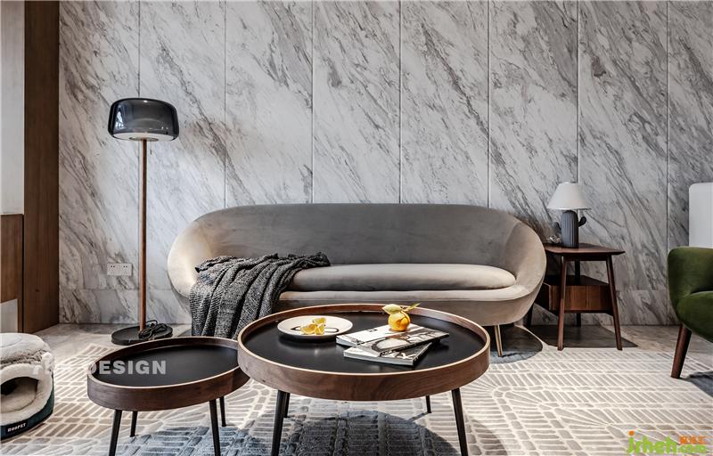 簡約圓形茶幾錯(cuò)落搭配,增加空間層次感。地毯的搭配中和灰色冷色調(diào),融入更多溫馨的氛圍。
