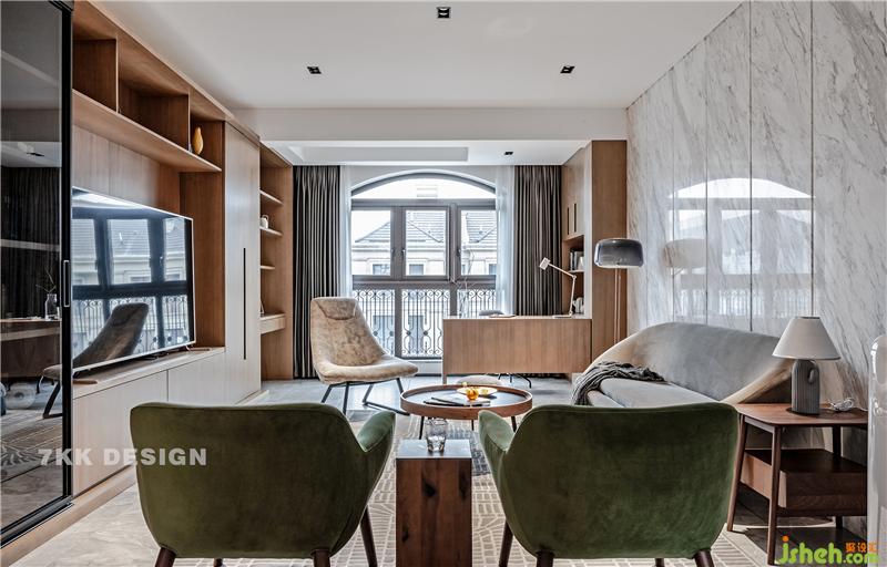 陽臺(tái)納入客廳打造開放式書房。定制書桌展示柜,擺放著一些書籍和陶制品搭配,木質(zhì)元素讓空間變得自然舒適。茶幾上的水果擺盤,很精致。