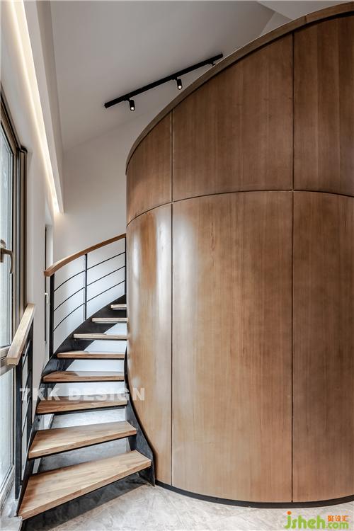 圍繞柱形的個(gè)性弧形旋轉(zhuǎn)樓梯盤旋而上,鏤空臺(tái)階懸空設(shè)計(jì)讓空間看起來更簡約,精致,很適合小戶型設(shè)計(jì)。