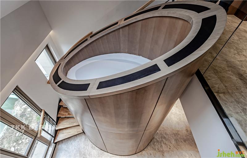 從閣樓看衛(wèi)生間柱形結(jié)構(gòu),似竹型傲立于空中(挑空的設(shè)計(jì)更好的利用了閣樓坡度的空間),從閣樓可以看到樓下的動(dòng)態(tài)。