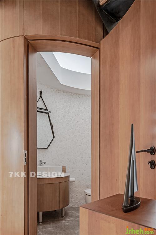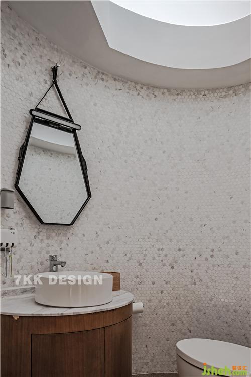 衛(wèi)生間干區(qū)(臺(tái)盆+馬桶),頂部采用不規(guī)則幾何形亞克力材質(zhì),引入自然光線。在白天不開燈的狀態(tài)下,里面也很明亮。