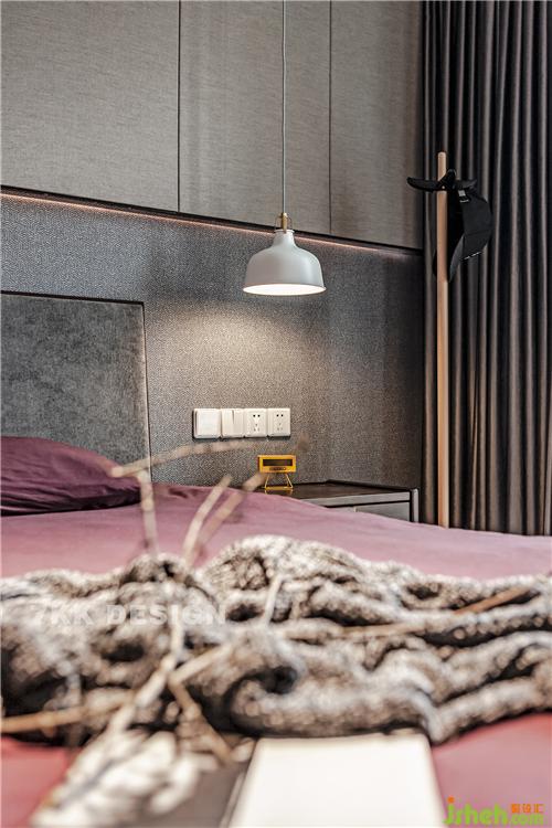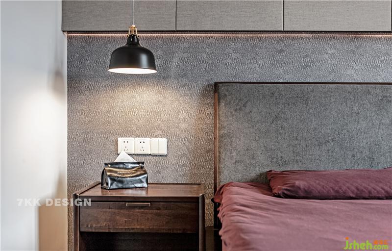為擁有更多的儲物功能,業(yè)主要求床頭增加一排吊柜,隱藏式門板讓空間更完整簡潔。床頭背景墻采用富有肌理的壁紙鋪貼,左右黑白搭配的吊燈為空間帶來不一樣的時尚感。