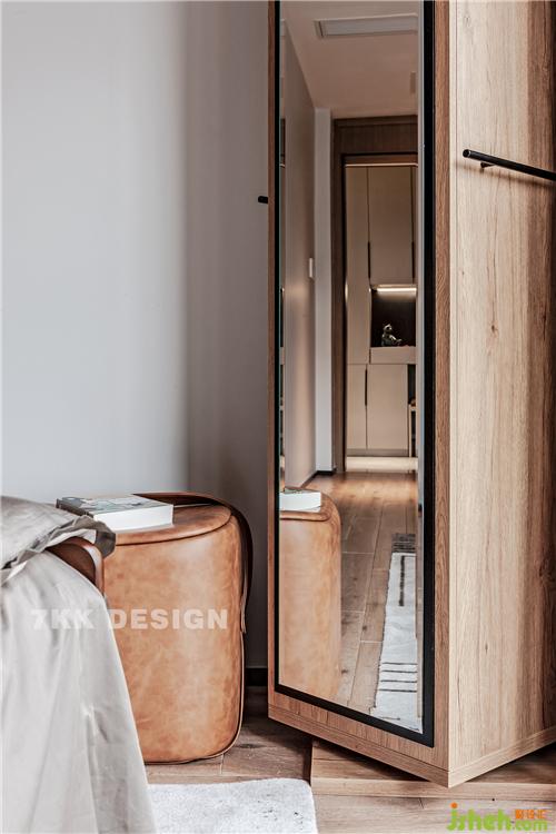 床尾靠窗一角選擇成品的多功能鏡面柜,可以360度旋轉(zhuǎn),后面是柜體里面可以收納衣物使用。