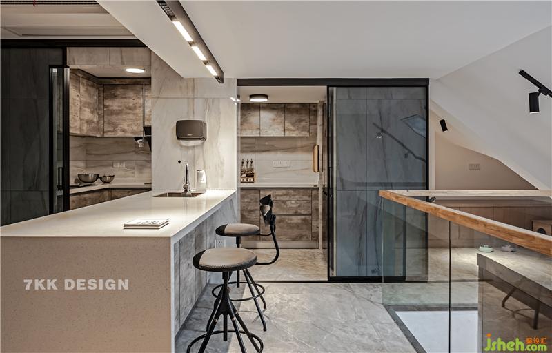 閣樓從樓梯上來為西廚吧臺+餐客廳結(jié)合開放式空間。這里空間是閣樓最高的空間3.1m高,蘇州裝修設(shè)計(jì)人站立處于比較舒適的位置。 餐桌椅選擇經(jīng)典黑色,質(zhì)感充滿時尚感。精致的餐具及裝飾品的點(diǎn)綴給空間帶來活力。