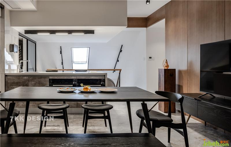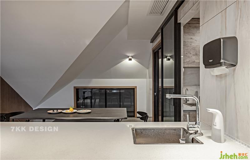 白色西廚吧臺和黑色餐桌和諧搭配,最里面的頂部斜坡造型讓整體空間更加豐富立體。