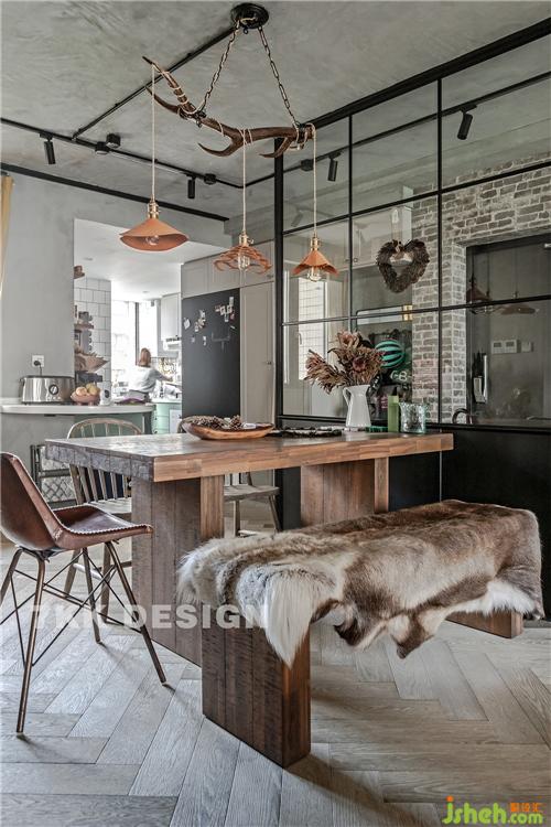 定制的吧臺(tái)柜下方做收納使用,墻面上也做了隔板架有序的放滿了食物,東西很多,卻雜而不亂,看出主人平時(shí)很愛干凈打理。柜子一側(cè)是定制的簾子,可以把狗狗隔離開來。
