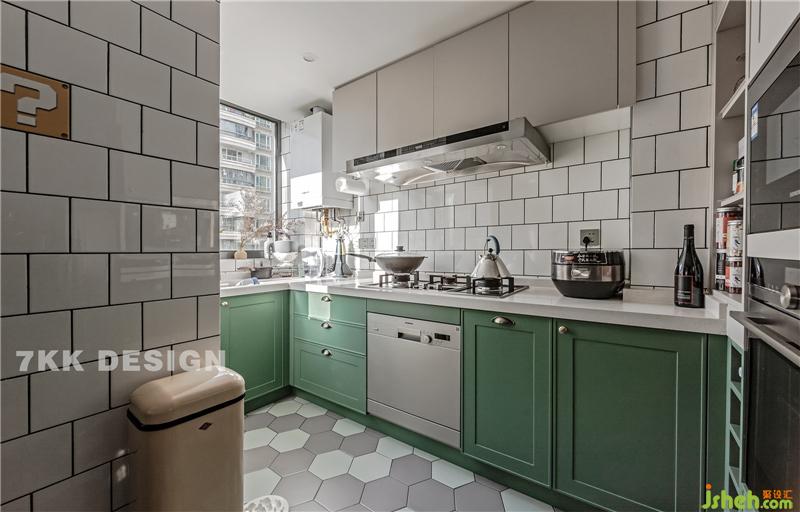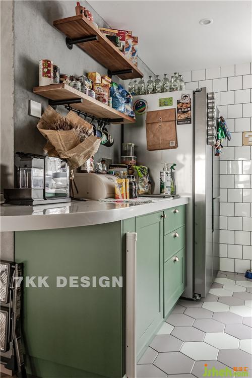 廚房打造干凈清爽的環(huán)境,墻面上選用白色墻磚,地磚采用菱形磚塊,櫥柜的顏色則是采用業(yè)主的意見,選用薄荷綠。因?yàn)闃I(yè)主習(xí)慣了國(guó)外的生活,平時(shí)喜歡吃的也是比較清淡類型的飯菜,沒有很重的油煙,打破原先的封閉式廚房改為了開放式廚房,擴(kuò)大視野感,增加家人之間的互動(dòng)性。