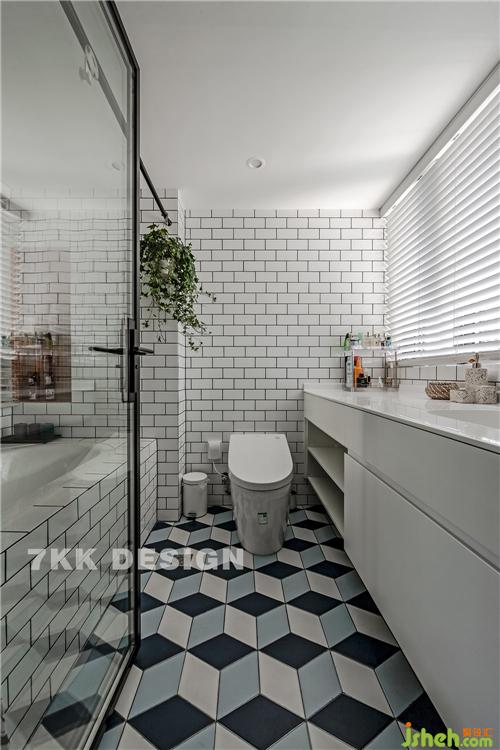 主衛(wèi)地磚選用三色菱形鋪地,墻面白色方形墻磚鋪貼,吊掛的綠植點(diǎn)綴,打造干凈清爽高顏值的衛(wèi)生間。