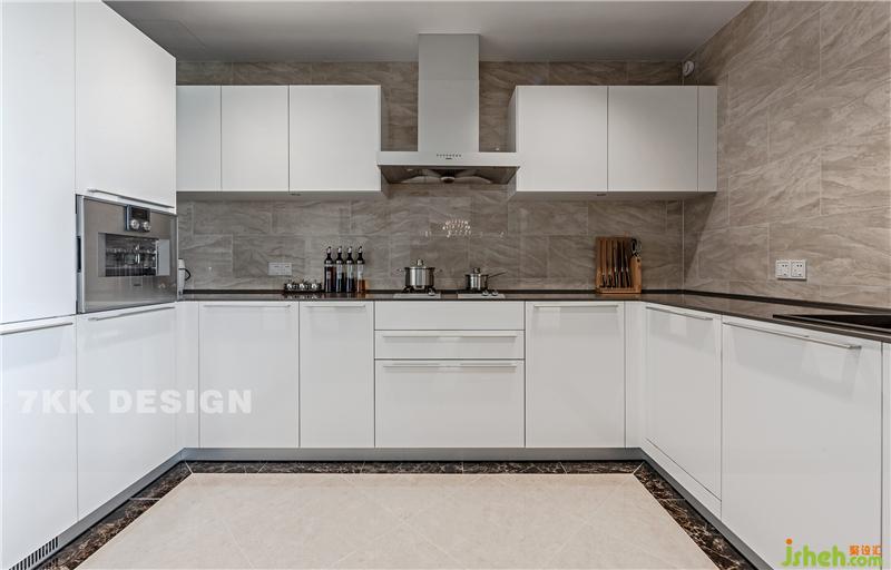 廚房L型臺(tái)面設(shè)計(jì)與整體櫥柜結(jié)合U型造型,整體櫥柜容納嵌入式烤箱冰箱+收納,整體櫥柜設(shè)計(jì)讓廚房更整潔干凈,白色櫥柜灰色臺(tái)面,淺咖紋理墻磚鋪貼,打造干凈清爽的烹飪環(huán)境。