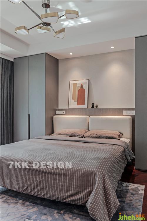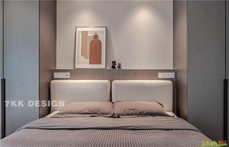 次臥營造沉穩(wěn)品質(zhì)的睡眠環(huán)境,床頭兩邊定制對(duì)稱的高級(jí)灰衣柜作為裝飾收納,床頭背景采用木質(zhì)與壁紙結(jié)合,上海裝修設(shè)計(jì)搭配一副抽象幾何裝飾畫打破沉穩(wěn)既定的格局,為臥室呈現(xiàn)視覺上的無限可能性。