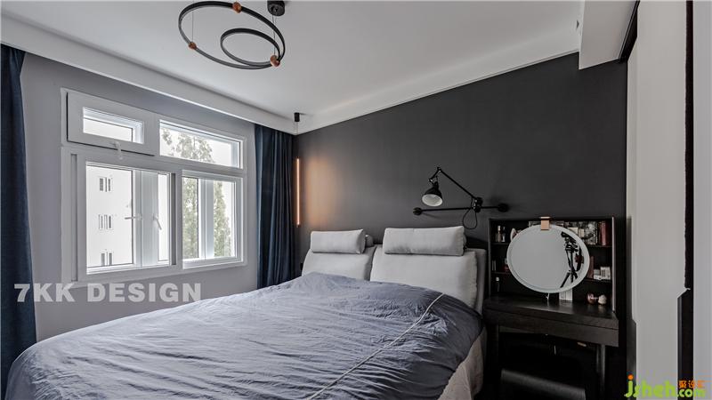臥室一角選擇成品床頭柜,主要作為女業(yè)主的化妝桌,上面擺滿了女主人的化妝用品。個性的圓形鏡子搭配,很有意境。墻面?zhèn)€性的可以自由調(diào)節(jié)角度的臺燈,為看書或者化妝補光使用。