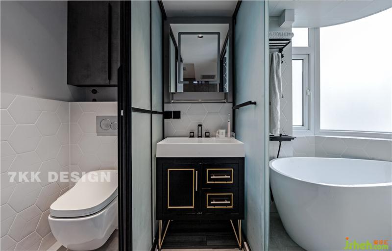 改變衛(wèi)生間的門的位置,衛(wèi)生間設(shè)計成現(xiàn)代比較流行的三分離式,馬桶,淋浴,干區(qū)獨立分開,使用起來也比較方便。 干區(qū)選擇黑色基調(diào)金屬元素勾勒的臺盆柜,超高顏值,時尚而精致,也方便打理。鏡子的搭配也很個性,正面可以顯示正常的時間和溫度,打開鏡子背面可以成小型收納空間放置日?;瘖y用品。 馬桶和淋浴空間都選擇磨砂玻璃移門,不影響采光,墻面采用白色菱形瓷磚拼接,打造干凈清爽的衛(wèi)生間空間。
