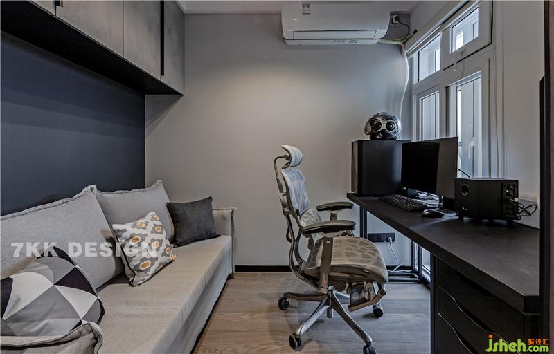 多功能房間書房+客房,靠窗一側(cè)選擇成品書桌,作為業(yè)主平時工作區(qū),一臺電腦。另一側(cè)靠墻選擇一張折疊沙發(fā),平時工作累了可以躺一下,或者有客人來也可以臨時入住。上方上方定制灰色吊柜增加收納功能,沙發(fā)背景墻選擇墻面深藍灰色調(diào),與沙發(fā)淺灰色墻面白色相協(xié)調(diào),營造一種簡約、寧靜而又品質(zhì)的的多功能辦公休息環(huán)境。