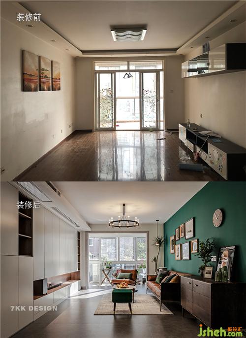 進(jìn)入客廳首先會(huì)被這一抹墨綠色的沙發(fā)背景墻吸引,和做舊木質(zhì)家具的搭配,既清新自然又帶點(diǎn)復(fù)古質(zhì)感,非常養(yǎng)眼。舒適的色彩搭配、個(gè)性的家具配置,每一個(gè)小角落都美的那么優(yōu)雅精致。恬靜的午后時(shí)光,靜靜地坐在陽(yáng)臺(tái)上,讓那縷縷陽(yáng)光斜射在臉上,這感覺真的很愜意。 業(yè)主說(shuō)不需要電視機(jī),溝通中一直和設(shè)計(jì)師強(qiáng)調(diào)要足夠的收納空間,所以整個(gè)電視背景墻以功能性為主,設(shè)計(jì)了一墻的定制柜,滿足業(yè)主收納的需求。(設(shè)計(jì)師說(shuō)如果是搭配成品簡(jiǎn)約的矮的電視柜再搭配些軟裝效果會(huì)更加,不過生活中總有些取舍,盡量滿足業(yè)主功能的需求上達(dá)到更好的視覺效果)。