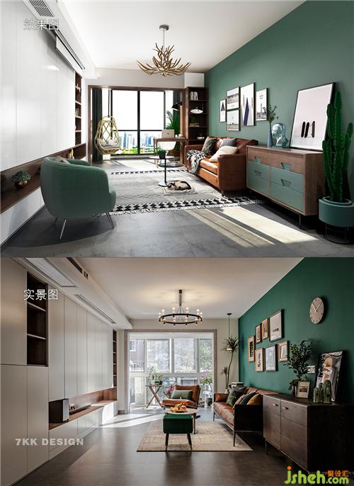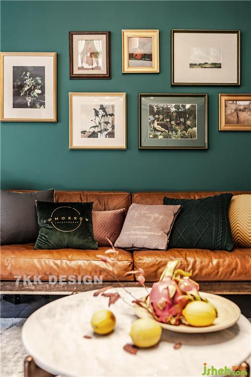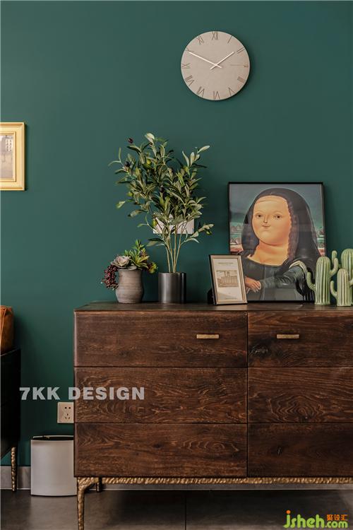 去拍攝的時(shí)候業(yè)主還沒有居住,不過里面大部分業(yè)主都已經(jīng)提前搭配好了,過兩天就搬家新家了。拍攝時(shí)設(shè)計(jì)師自己也帶了一些軟裝飾品送給業(yè)主。 沙發(fā)一側(cè)選擇紋路清晰做舊的裝飾斗柜,上面擺放業(yè)主自己種植的小盆栽,一副富態(tài)的“蒙娜麗莎”的掛畫作為點(diǎn)綴讓畫面更豐富,生動(dòng),更飽滿。整體在墨綠色的背景墻映襯下營(yíng)造一種復(fù)古清新自然的舒適感。