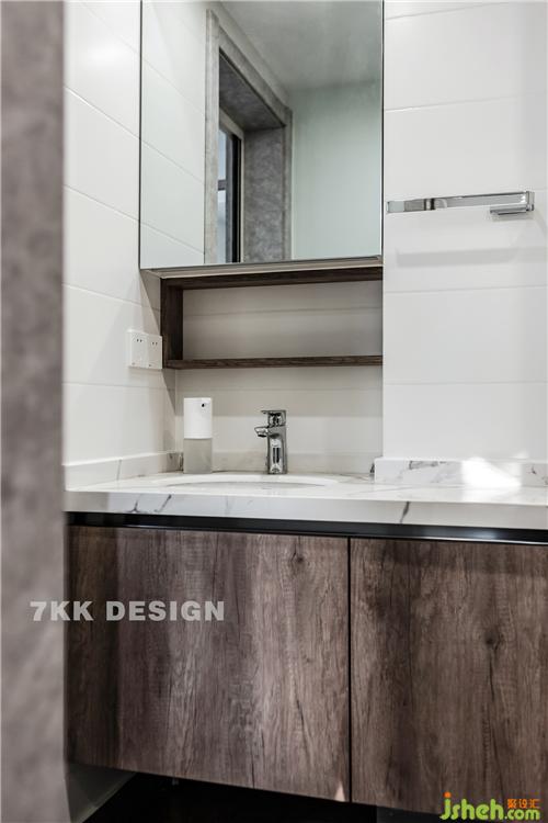 衛(wèi)生間改造成一個(gè),設(shè)計(jì)成干濕分離。簡約的白色方塊瓷磚,簡約清爽,鏡面打開里面可以放置業(yè)主平時(shí)收納的化妝用品和日常用品。