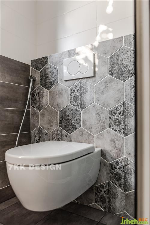 馬桶間,墻面選擇幾何形復(fù)古紋理的瓷磚+白色瓷磚拼接,時(shí)尚復(fù)古,干凈清爽。