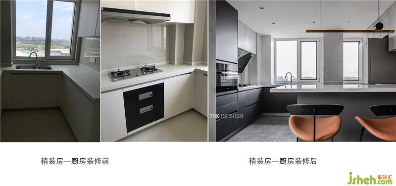 2、廚房原先是封閉式廚房連接著客衛(wèi),改造后的廚房,我們做成了開放式廚房,同時也把廚房和客衛(wèi)之間的墻體拆除掉了,整體擴大了廚房的空間。并設計了吧臺,來隔斷廚房和客廳空間,使得整體的空間區(qū)域分明,同時吧臺也可以做為餐桌使用。