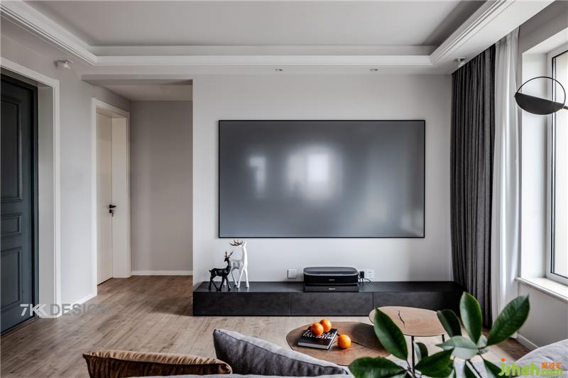 客廳電視背景墻采用一面超大投影屏幕,激光投影,擁有超高清的屏幕享受,很有科技感。空間頂面采用了無主燈的設計,讓空間更加通透敞亮。