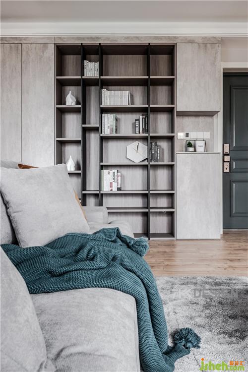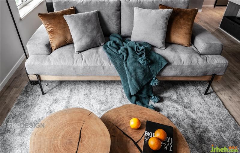 客廳的整體空間還是蠻大的,客廳有兩扇大窗,使的客廳的空間光線充足,同時搭配著方正的灰色系沙發(fā)和木系茶幾,灰色的地毯和定制柜,以及水泥色墻面,打造出時尚精致的工業(yè)風格。