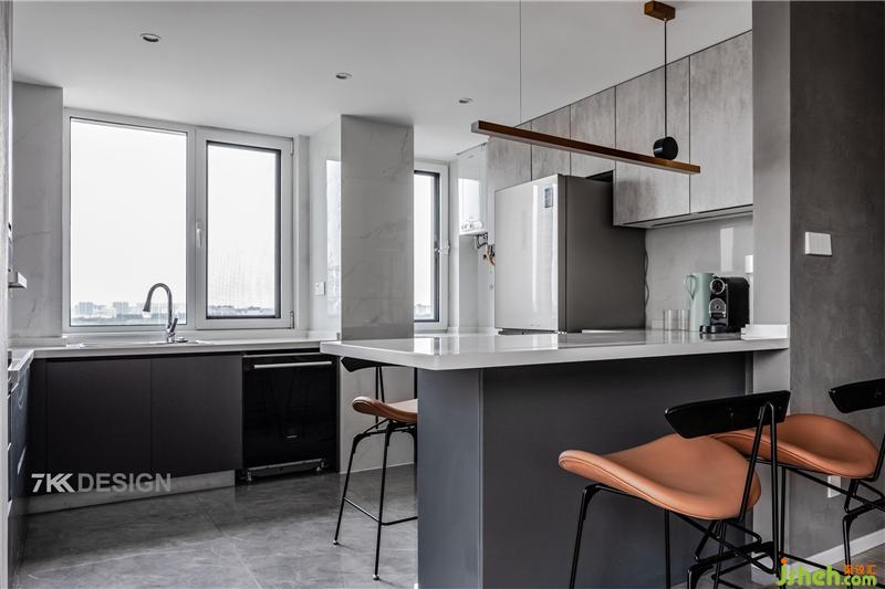 原始封閉式廚房整體拆除,擴大廚房面積,采用和客廳相互相的黑白灰色調(diào),定制吧臺設(shè)計低調(diào)的奢華感,開放式空間設(shè)計使空間更寬敞明亮。