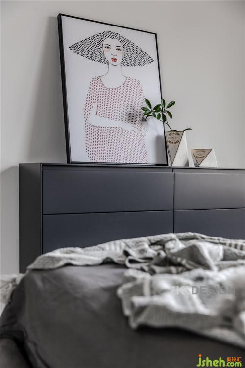 主臥延續(xù)整屋的灰色主色調(diào),床頭背景墻中間用做溫潤質(zhì)感的木質(zhì)欄杉裝飾造型中和臥室的冷色調(diào),兩邊再搭配著金色吊燈,配上灰色系的床品,窗簾,黑色邊框的玻璃衣帽間,打造穩(wěn)重質(zhì)感的睡眠環(huán)境。