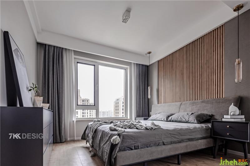 灰色背景墻與線條感的木質(zhì)欄杉背景墻結(jié)合打造質(zhì)感的睡眠空間。
