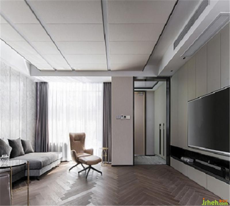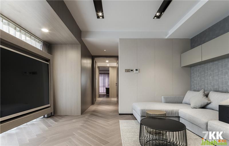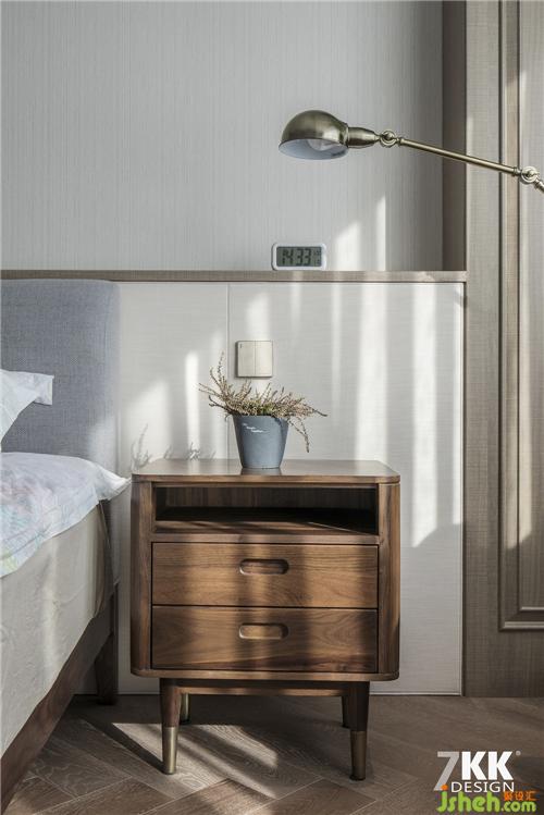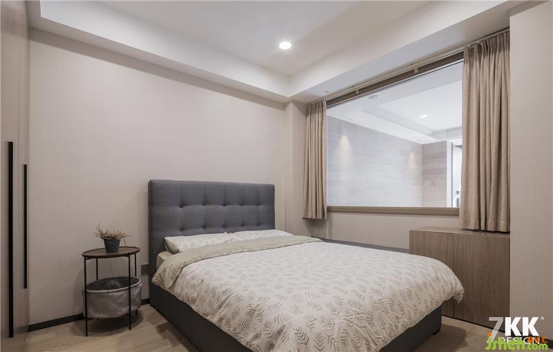 主臥室,U型的衣帽間可以供主臥和次臥同時(shí)使用,衣帽間的外觀采用線條紋理空間感更加利落美觀。吊頂一側(cè)做了中央空調(diào)。人字型拼接地板,淺灰色床頭搭配素色床品打造一個(gè)純凈的睡眠環(huán)境。