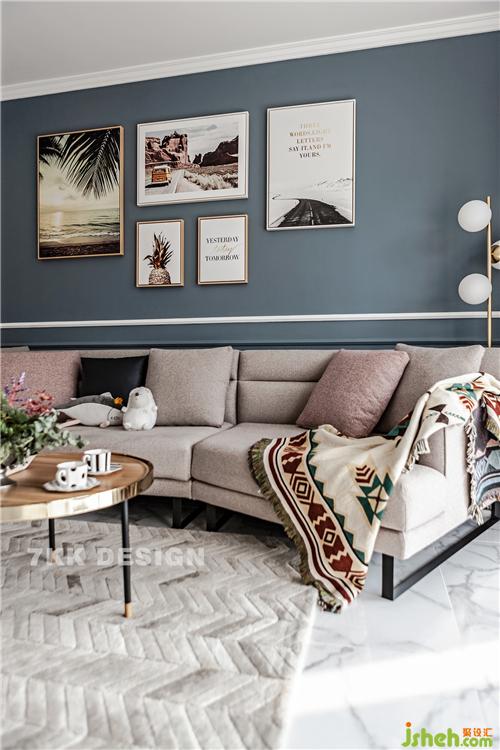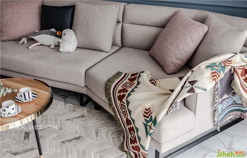 在選擇地面材質的時候業(yè)主是比較糾結的,一開始設計師建議用木地板家居會更溫馨舒適些,但是男業(yè)主比較偏向瓷磚,打理起來會比較方便,最終設計師在滿足業(yè)主選用瓷磚的情況下,選用地毯搭配調和冷色調,增加層次感。
