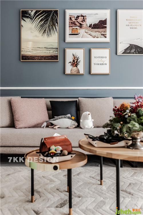 沙發(fā)選擇2.7m長可坐3-4人,墻面選用暖色調的掛畫作為裝飾,錯落的圓形茶幾上面擺放的插花,收納盒,咖啡杯,訴說著業(yè)主生活的點點滴滴,精致而有品位。