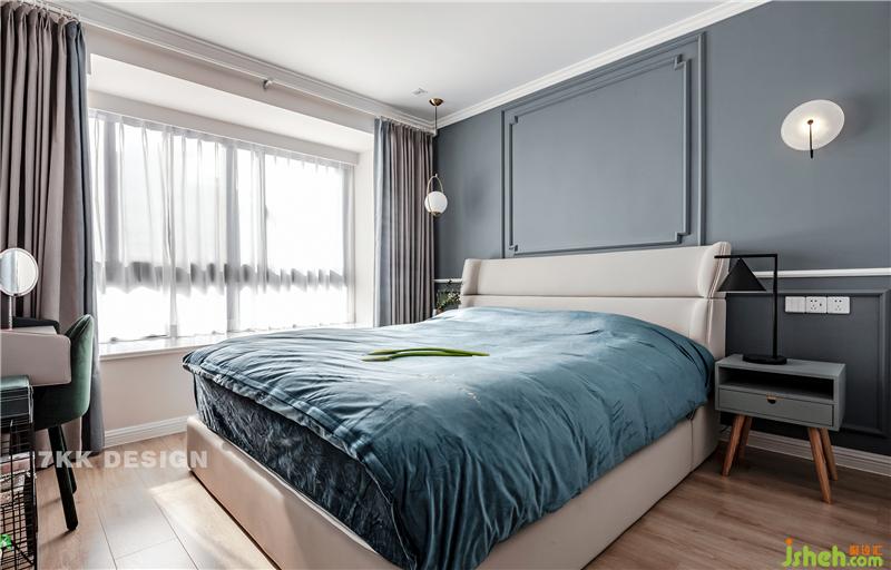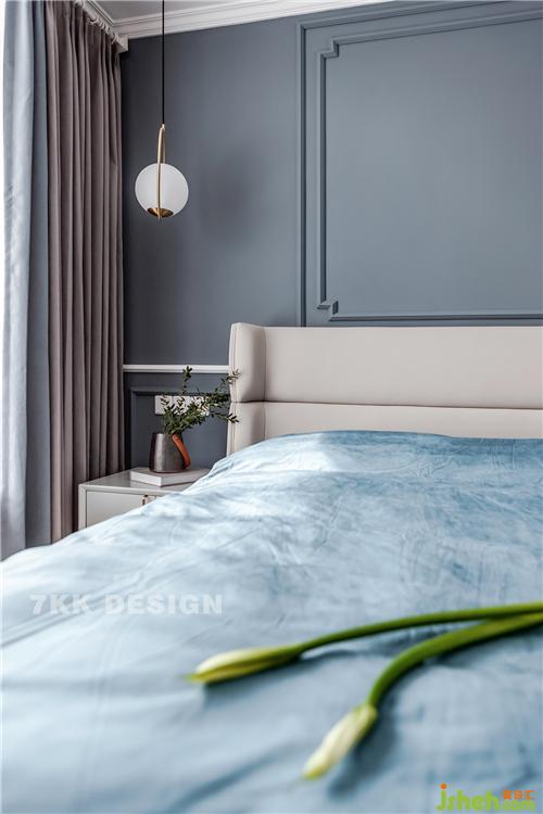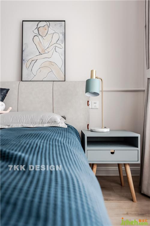 業(yè)主真的是比較喜歡藍色的,床品選擇藍色的搭配+床頭柜一抹綠色點綴,營造靜謐的睡眠空間。