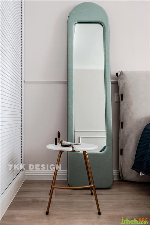床尾靠墻角一張簡單的化妝桌,上海裝修設(shè)計上面有秩序的擺滿了女主人的化妝品,每天最精致的裝扮從這里開始。墨綠色的靠背椅子給長時間化妝帶來更多的舒適感。