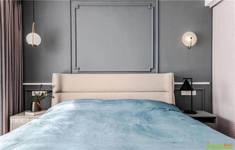 主臥床頭背景墻色調(diào)與客廳沙發(fā)背景墻相呼應(yīng),石膏板線條豐富墻面立體感。
