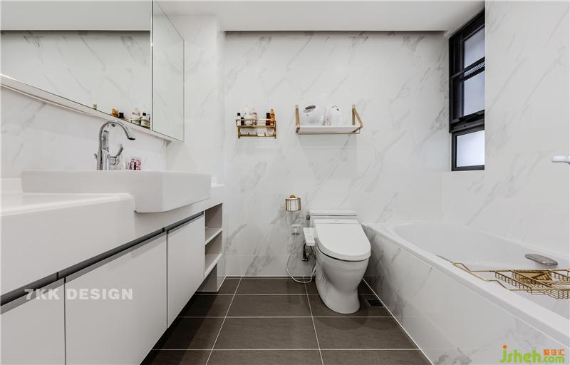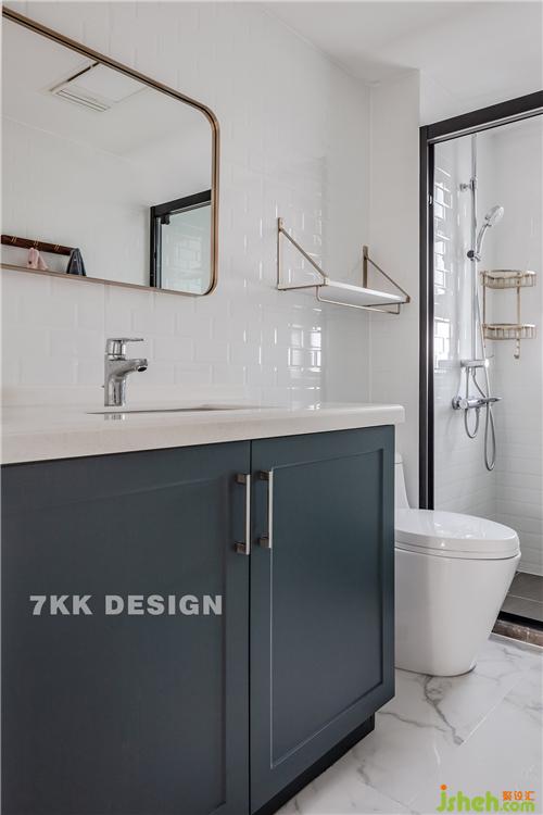 次衛(wèi)L型,臺盆柜+馬桶+淋浴房。也是白色為主,鏡框+裝飾架金屬元素點綴,營造精致清爽的衛(wèi)生環(huán)境。