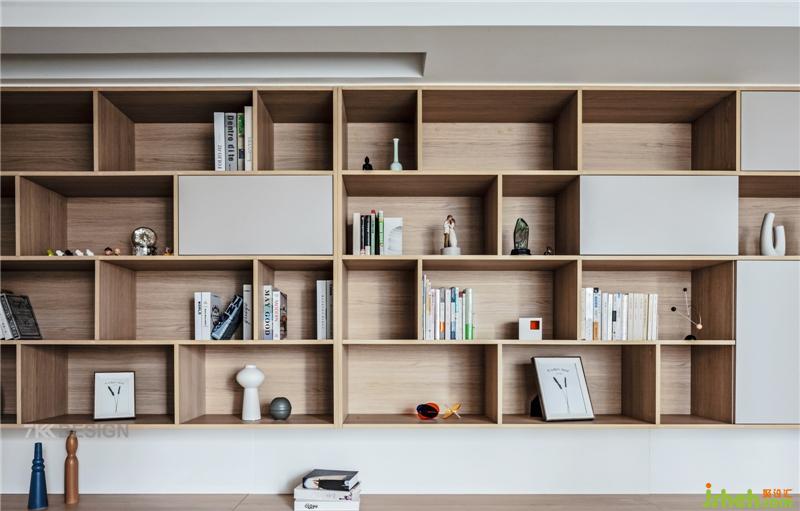 4、把兒童房和客廳的墻體敲到陽(yáng)臺(tái)的承重墻位置,擴(kuò)大兒童房的面積,定制一面到頂?shù)囊鹿褡鳛閮和渴占{使用。接近客廳陽(yáng)臺(tái)一側(cè)墻面定制書(shū)柜收納使用,增加了更多的儲(chǔ)物空間。