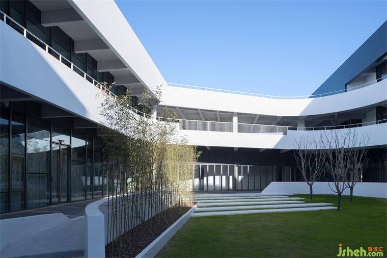 nobilia & raumplus Asia-Pacific r&d headquarters is envisioned as a micro-environment accommodating functions such as research, experimentation, management, exhibitions, and product launches. From a plan view, four intersecting rectangular volumes enclose a long courtyard. In section, the lower level's large volume is outlined by artificial stone, while the glass curtain-walled second floor is a sculptural volume wrapped in zinc panels. The exterior design of the building is deeply inspired by the sharp lines of German sports cars (such as the BMW M1). The internal garden serves as a central gathering place for all departments of the research center and also functions as an informal outdoor stage, equipped with tiered seating and a central stage. All three levels of office space open to the internal garden, providing both natural light and access to the central space via balconies and terraces. The elongated courtyard also evokes the timeless Fiat factory in Turin, Italy.